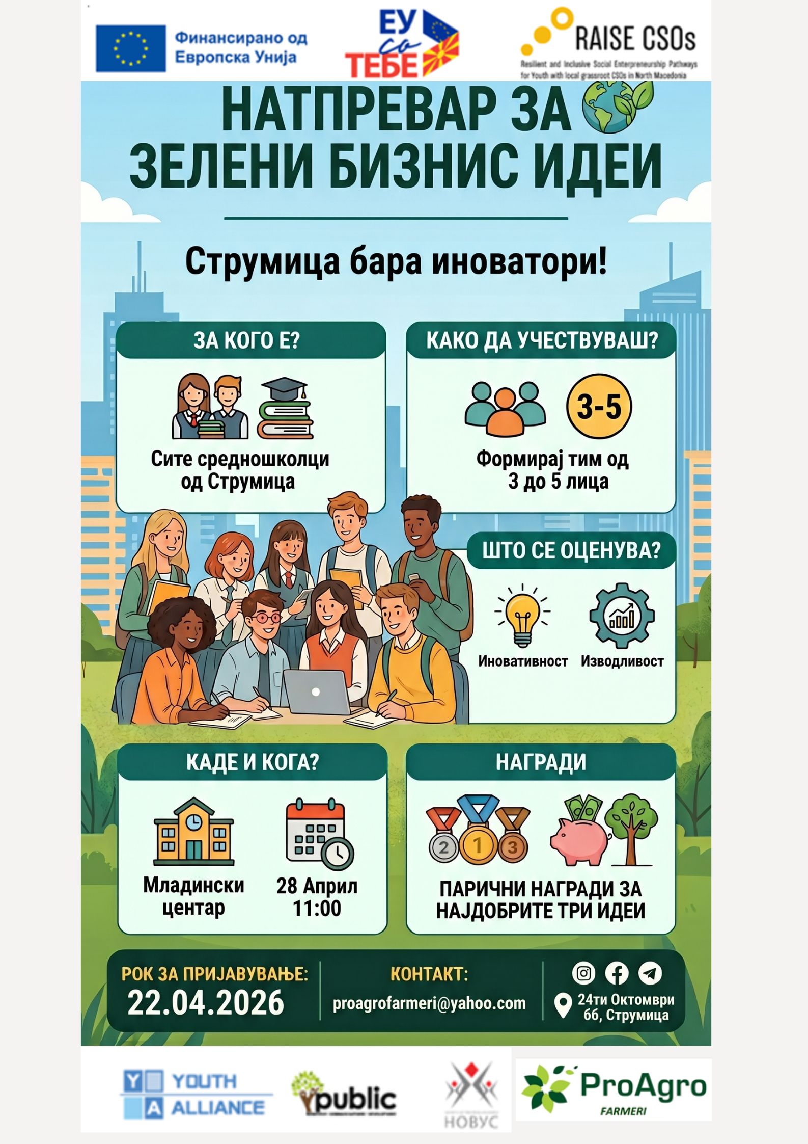 Здружението Проагро Фармери, во рамките на проектот GREENHUB4IDEA, Ве поканува да учествувате на натпреварот за Зелени Бизнис Идеи – настан наменет за сите средношколци од Струмица кои имаат иновативни идеи со зелен и одржлив карактер.