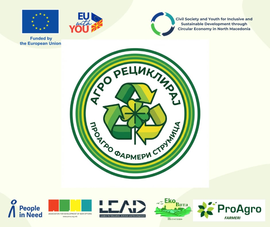 • Активно вклучување на младите и ранливите групи во процесите на циркуларната економија Проектот „АгроРециклирај“ е дел од проектот „Граѓанско општество и млади за инклузивен и одржлив развој преку циркуларна економија во Северна Македонија“, спроведуван од PIN, АРНО, LEAD и Ековита, а финансиран од Европската Унија.