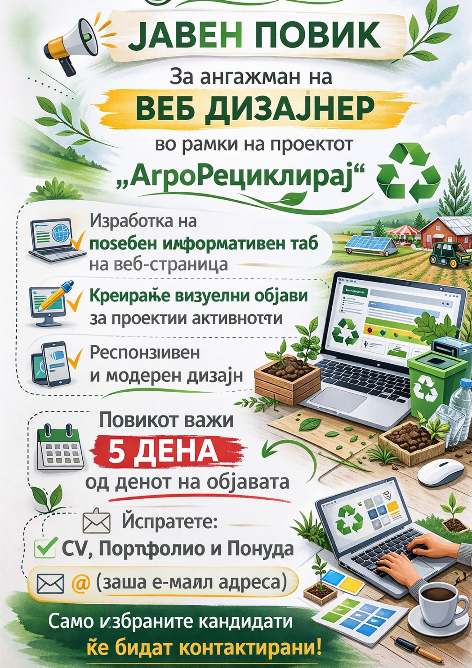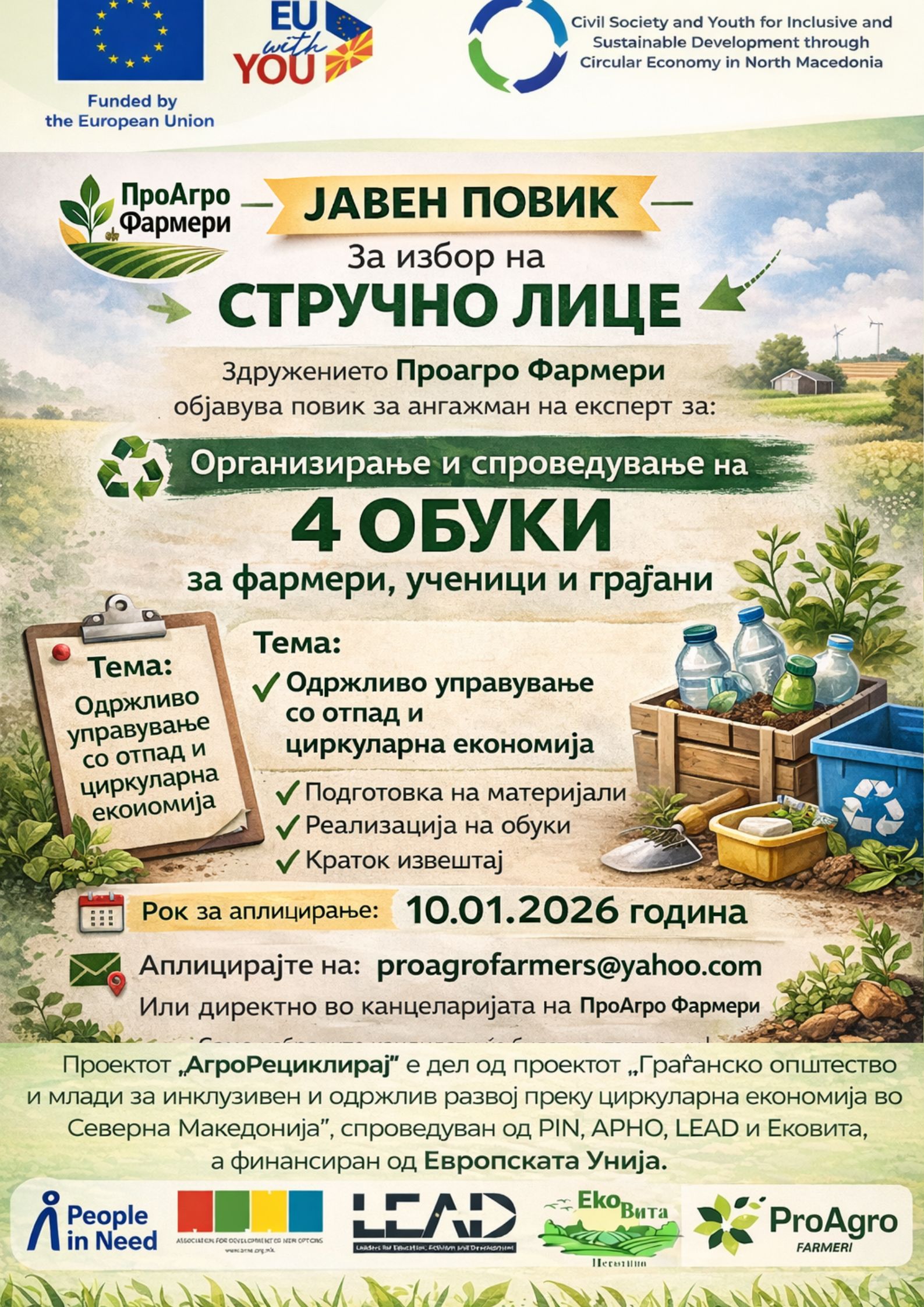 📢 ЈАВЕН ПОВИК За избор на стручно лице за спроведување обуки за одржливо управување со отпад Здружението Проагро Фармери, во рамки на проектот „АгроРециклирај“, објавува јавен повик за избор на стручно лице за организирање и спроведување на 4 обуки за фармери, ученици и граѓани на тема одржливо управување со отпад и циркуларна економија. 🎯 Цел […]